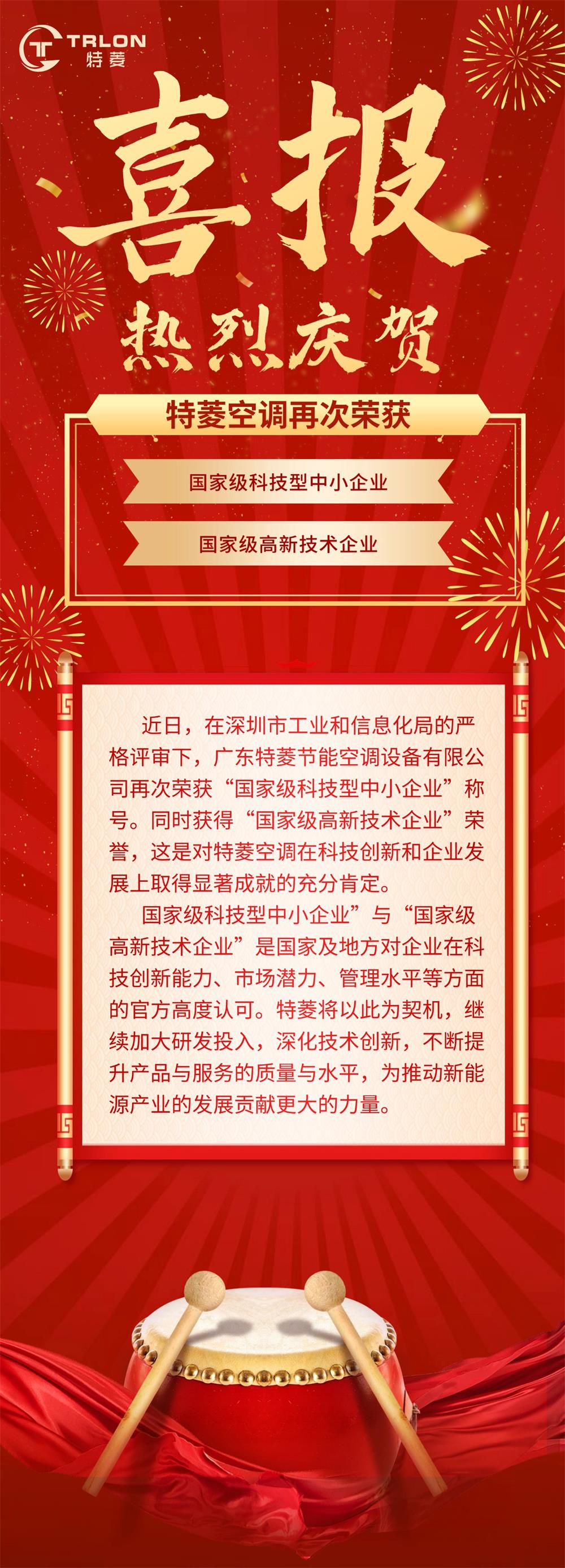 喜訊!特菱空調再次榮獲國家級科技型中小企業稱號和高新技術企業稱號